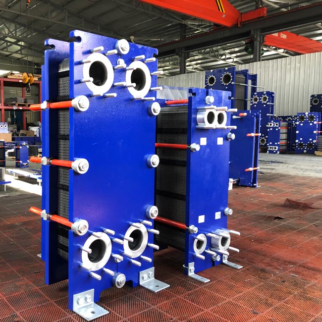 板式換熱器是由框架、傳熱板片組及夾緊螺栓等主要部件組成。框架包括一個固定壓緊板和一個活動壓緊板,由上導桿與下導桿支承,在另端有一支柱。壓制成的波紋板片懸掛在兩板之間的上導桿上,移動活動壓緊板將板片組壓緊,再用一組夾緊螺柱將固定壓緊板和活動壓緊板夾緊至一定尺寸。兩種介質(zhì)經(jīng)固定(或活動)壓緊板上法蘭孔流入由波紋板片組成的各自通道,熱交換后介質(zhì)再由固定(或活動)壓緊板上的法蘭孔流出。同定壓緊板、活動壓緊板、支柱及導桿均為低碳鋼。考慮到用戶的多種使用要求,框架設(shè)計有多種型式,主要有雙支撐框架式和常用的落地式等,也可根據(jù)用戶的要求更改框架的型式。